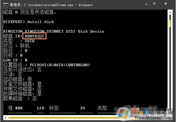 5、選好要查看的硬盤后,寫入detail disk,打開回車后會將硬盤的信息顯示出來,其中磁盤ID就是大家要查找的硬盤序列號。