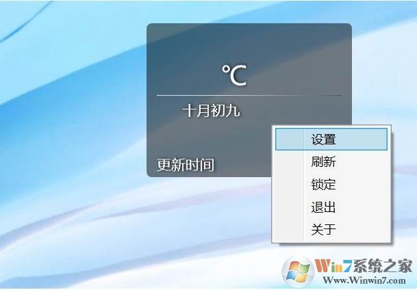 2、安裝完成后,桌面右上角就多了一個(gè)透明的天氣小浮窗了。最開始只顯示有簡單的時(shí)間,需要簡單設(shè)置一下才可以使用,具體操作是再天氣浮窗上,右鍵鼠標(biāo),然后點(diǎn)擊“設(shè)置”,如圖所示。