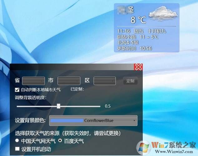 三、在設(shè)置中,可以選擇天氣來源(建議選百度,速度會(huì)更快一些),自定義天氣地點(diǎn)、設(shè)置背景顏色、設(shè)置是否開機(jī)自動(dòng)啟動(dòng)等等,這里根據(jù)自己的喜歡選擇即可,一般選擇“自動(dòng)判斷本地天氣”即可,如下圖所示。