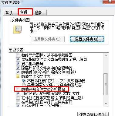 打開:"我的電腦"->標(biāo)題欄的"工具"->選"文件夾選項(xiàng)"->"查看"標(biāo)簽->移動(dòng)滾動(dòng)條->選定"隱藏已知文件類型的擴(kuò)展名"->確認(rèn)退出