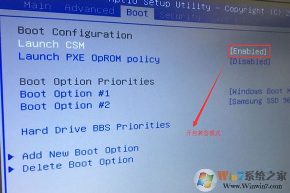 2、切換到BOOT的選項,把Launch CSM由disabled改成enabled,開啟兼容模式,然后按F10保存設(shè)置;