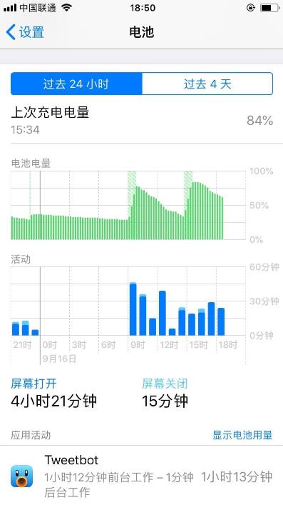 iOS 12 提供了更詳細(xì)的電池用量信息。從原先的「過去 24 小時」和「過去 7 天」變?yōu)椤高^去 24 小時」和「過去 4 天」,還增加了柱狀圖用來顯示設(shè)備的電池用量和使用時間。