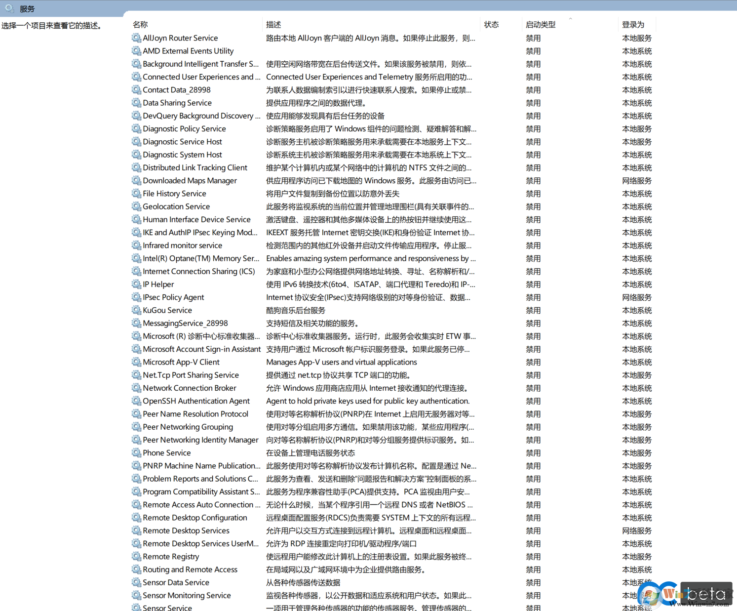 Background Intelligent Transfer S..使用空閑網絡帶寬在后臺傳送文件。如果該服務被禁用,則依..禁用Connected User Experiences and..Connected User Experiences and Telemetry服務所啟用的功禁用Contact Data 28998為聯(lián)系人數(shù)據(jù)編制索引以進行快速聯(lián)系人搜索。如果停止或禁..