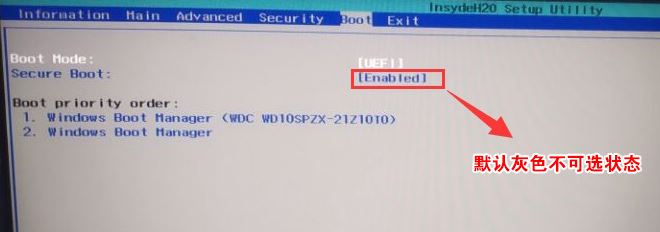 1、開機(jī)一直按F2進(jìn)入BIOS,按F2進(jìn)入BIOS界面,首先我們要關(guān)閉安全啟動(secure boot選項默認(rèn)為enabled),切換BOOT項后發(fā)現(xiàn)secure boot灰色不可選狀態(tài),如下圖所示;