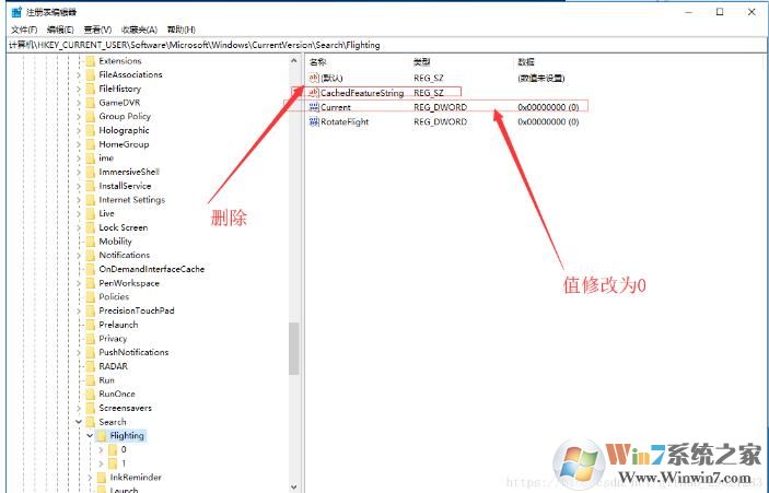3、然后在右側(cè)我們把CacheFeatureString 這個(gè)值刪除,然后把current 的值改成0;
