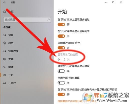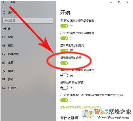 3、這時(shí)我們?cè)倩氐介_始菜單設(shè)置,我們就可以把 顯示最常用的應(yīng)用 開關(guān)打開了。