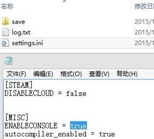 1、首先,找到游戲的用戶配置文件,一般是和用戶存檔文件在一起(也有特殊情況),可以看到一個名為setting.ini文件,如果找不到,可以用F3搜索文件名。用記事本打開,將ENABLECONSOLE = false中的false改成true然后保存退出。