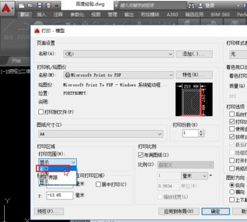 3、接著我們?cè)诖蛴≡O(shè)置界面:選擇打印機(jī)的名稱為Microsoft print to PDF,選擇圖紙的大小,如下圖所示: