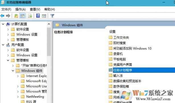 2、在本地組策略編輯器中,依次打開“用戶配置→管理模板→Windows組件”分支,在右側(cè)窗格中雙擊“任務(wù)計劃程序”,如圖: