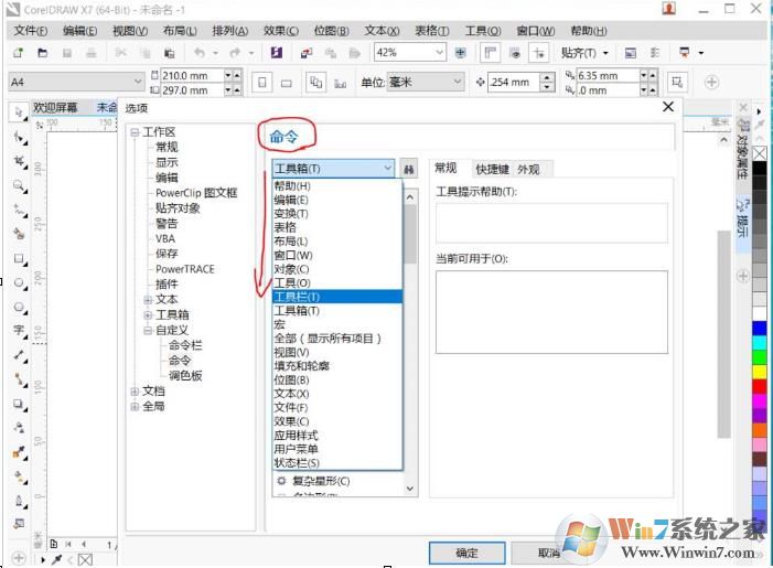 3、然后展開工作區(qū)——自定義——命令,進入設(shè)置界面,如下圖;