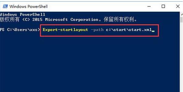 4、這時就會打開Windows Powershell窗口,在這里輸入命令Export-startlayout –path c:\start\start.xml,其中c:\start就是我們剛剛在上面建立的文件夾,你可以根據(jù)自己實際情況來設(shè)置相應(yīng)的路徑;