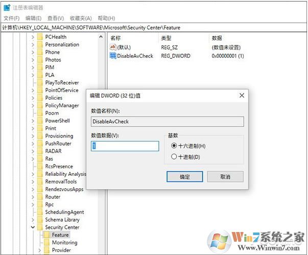 4、定位到以下路徑“計(jì)算機(jī)\HKEY_LOCAL_MACHINE\SOFTWARE\Microsoft\Security Center\Feature”,然后在右側(cè)欄空白處右擊鼠標(biāo),新建一個(gè)DWORD(32)值,重命名為“DisableAvCheck”并賦值為“1”;