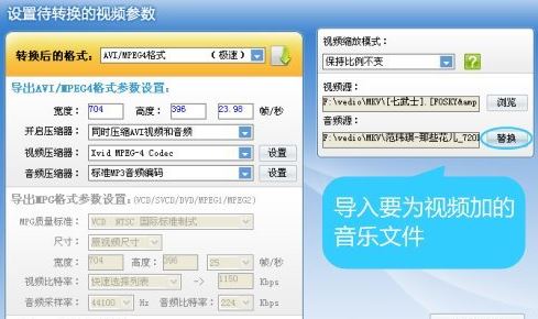 3、導(dǎo)入視頻進(jìn)入“設(shè)置待轉(zhuǎn)換的視頻參數(shù)”對(duì)話框后,在右上角“音頻源”處,點(diǎn)擊“替換”按鈕,將要替換進(jìn)入視頻的音樂文件導(dǎo)入,給視頻加音樂的過程就完成了