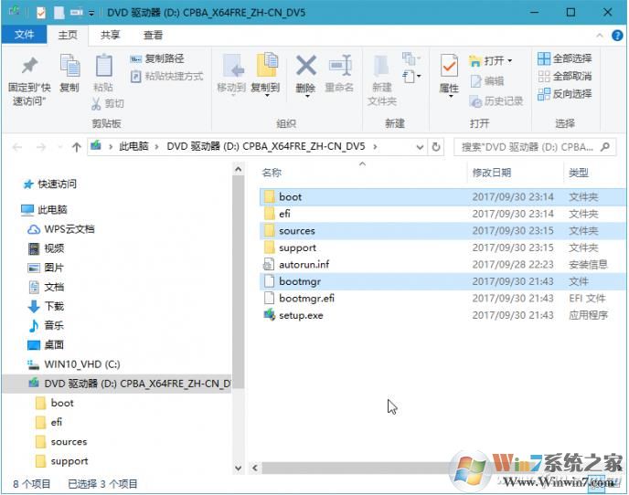 隨后,新打開的資源管理器窗口中會自動出現(xiàn)安裝文件列表,這時選中boot和sources目錄以及bootmgr文件,拷貝到要安裝系統(tǒng)的磁盤分區(qū)中(圖3)。