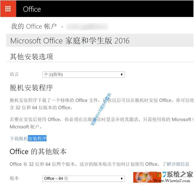 3、這時會出現(xiàn)一個非常亮眼的“安裝”按鈕,這是在線安裝程序,也就是下載后聯(lián)線安裝的。默認(rèn)會下載32位的office,如果你想下載64位的office或者想要下載Office離線安裝程序,則需要點(diǎn)擊“語言和安裝選項”,進(jìn)入如下圖所示界面: