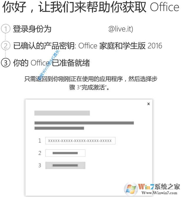 1、之后我們再點(diǎn)擊第三步“完成激活”按鈕,這時會讓你輸入與此Office關(guān)聯(lián)的微軟賬戶,也就是你剛才添加到的微軟賬戶。點(diǎn)擊“下一步”,就可以看到在你的微軟賬戶中找到的產(chǎn)品了,正是剛才添加的“Microsoft Office學(xué)生和家庭版2016”。如圖:
