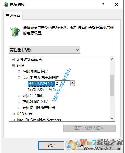 無人參與系統(tǒng)睡眠超時(shí)這一項(xiàng)默認(rèn)是隱藏的,只有在注冊表編輯后才能顯示出來,事實(shí)證明也就是因?yàn)榇隧?xiàng)設(shè)置導(dǎo)致Win10兩分鐘無操作就進(jìn)入休眠。