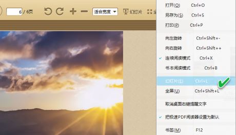 而后一種方式可使用極速PDF閱讀器的幻燈放映模式,點擊極速PDF閱讀器窗口右上角的倒三角設(shè)置按鈕,或直接執(zhí)行Ctrl+L組合鍵命令,然后選擇“幻燈片”(高版本直接點擊工具欄按鈕),PDF文檔就進入幻燈片播映狀態(tài),點擊鼠標到下一頁,用右鍵菜單控制播放,如下圖所示: