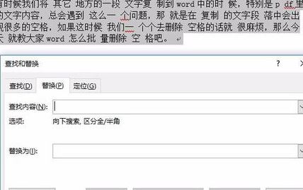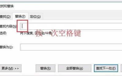 3、在查找內(nèi)容窗口中按一下鍵盤上的空格鍵,就會將空格填入到查找框中了,這時候替換的內(nèi)容框我們不要輸入任何內(nèi)容。