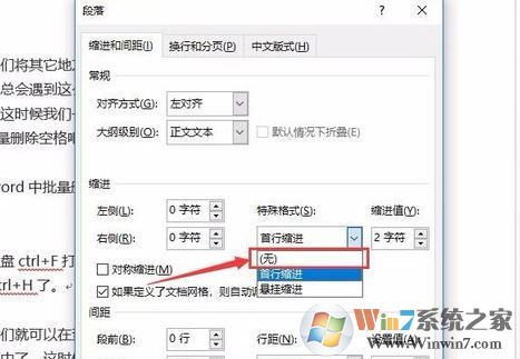 2、將首行縮進(jìn)修改成無,確定后我們word中的文章首行的空格就批量刪除了。