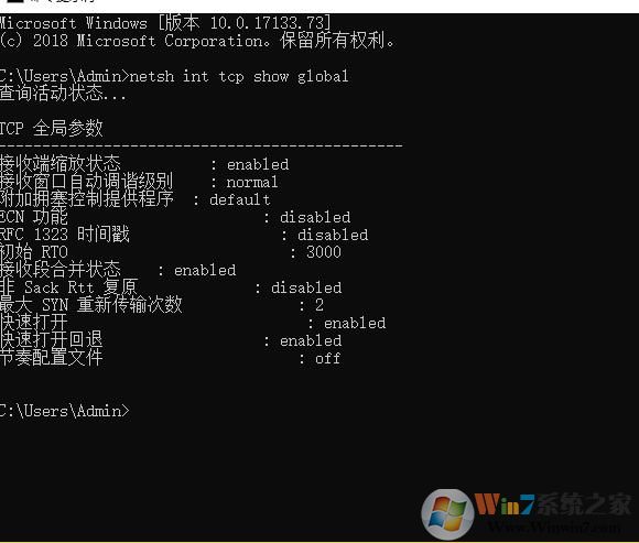 命令提示符輸入:netsh int tcp show global 進(jìn)行查詢