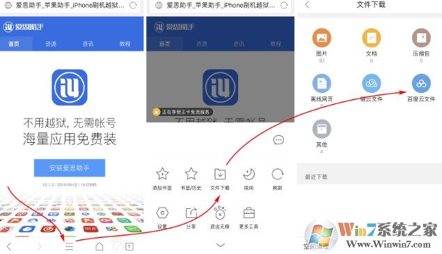 1、首先我們在iPhone手機中打開愛思助手,安裝QQ瀏覽器,打開瀏覽器,依次點擊菜單——文件下載——百度云文件,然后登陸百度網(wǎng)盤賬號。