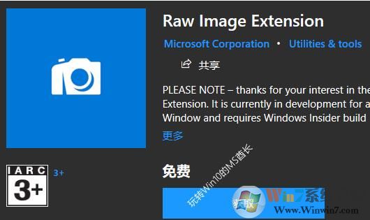 在打開的“購買 Raw Image Extension”網(wǎng)頁中點(diǎn)擊“獲取”按鈕就會(huì)打開Windows10自帶的Microsoft Store,直接顯示Raw Image Extension頁面。