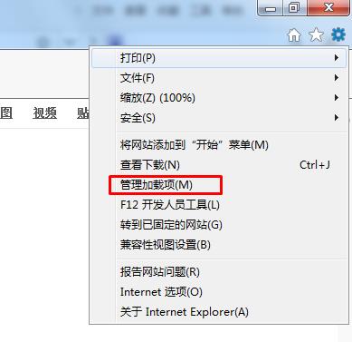 1、打開IE瀏覽器,點(diǎn)擊右上角的設(shè)置圖標(biāo),然后選擇“管理加載項(xiàng)”,如下圖;