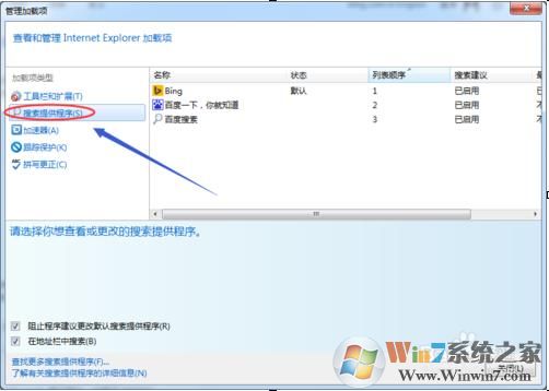 2、在管理加載項(xiàng)窗口,我們將默認(rèn)的“工具欄和擴(kuò)展”切換至“搜索提供程序”