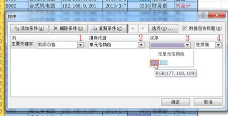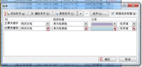 3、因?yàn)橛袃煞N單元格顏色,還要在[排序]對(duì)話框中[添加條件],按照?qǐng)D示順序設(shè)置,最后確定