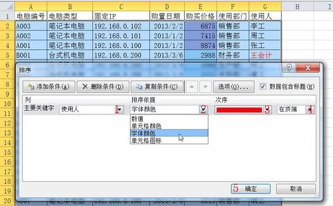 5、以這張工作表為基礎(chǔ),下面對(duì)工作表中字體顏色排序,點(diǎn)擊工作表中的任意一個(gè)單元格,依次按鍵盤上的[ALT]-[H]-[S]-[U],調(diào)出[排序]對(duì)話框,按照?qǐng)D示順序選擇設(shè)置,最后[確定],如圖: