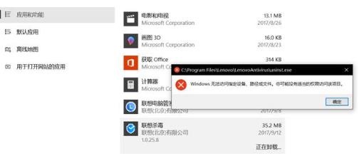 在設(shè)置中卸載可能會(huì)出現(xiàn)以下錯(cuò)誤。此為殺毒軟件的保護(hù)機(jī)制,需要在控制面板的程序和功能中對(duì)程序進(jìn)行卸載即可