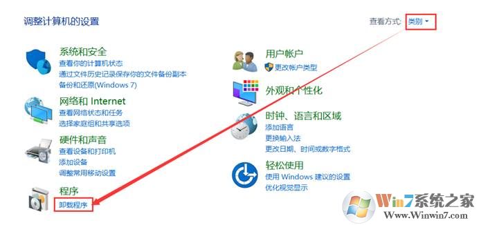 2、右上角查看方式選擇“類別”后,選擇下發(fā)卸載程序打開;
