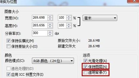 6.勾選“保持圖層”或“透明背景”,“確定”。這里的圖像大小可以不管,100%就行。
