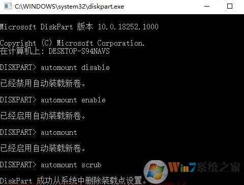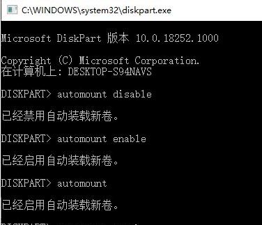 如返回信息“已經(jīng)禁用自動(dòng)裝載新卷”,說明當(dāng)前是禁用狀態(tài);