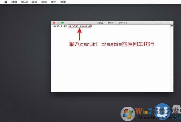 3、終端內(nèi)輸入命令:csrutil disable 然后回車執(zhí)行,注意中間有個(gè)空格。