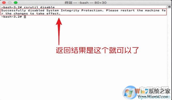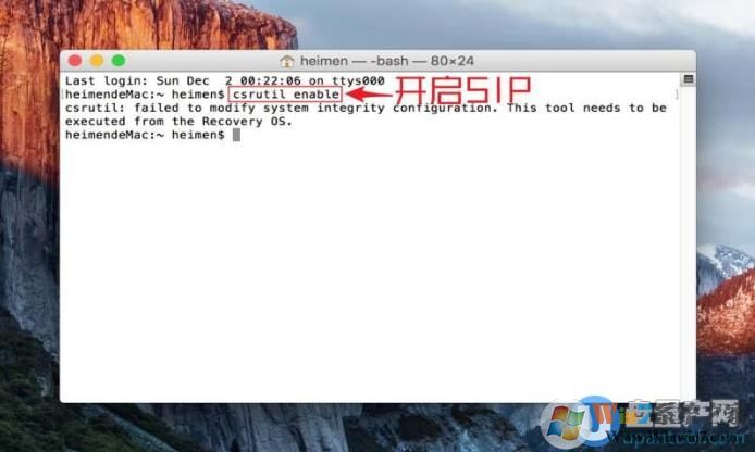7、如需重啟開啟SIP,在Mac OS終端內(nèi)輸入命令:csrutil enable 然后回車,這樣就成功開啟了。