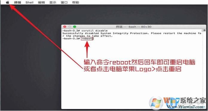 5、終端內(nèi)輸入命令reboot即可重啟電腦,或者點(diǎn)擊Apple logo然后點(diǎn)擊重啟。