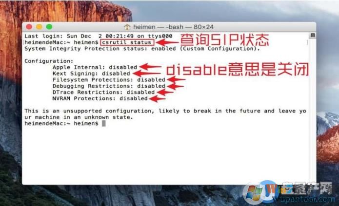 6、查詢SIP狀態(tài),在終端內(nèi)輸入命令:csrutil status 然后回車