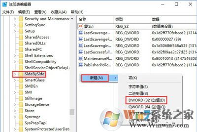 2、在注冊表左側(cè)依次展開:HKEY_LOCAL_MACHINE/SOFTWARE/Microsoft/Windows/CurrentVersion/SideBySide,在右側(cè)單擊右鍵點擊【新建】-【DWORD(32位)值】,將改制命名為【 PreferExternalManifest】。
