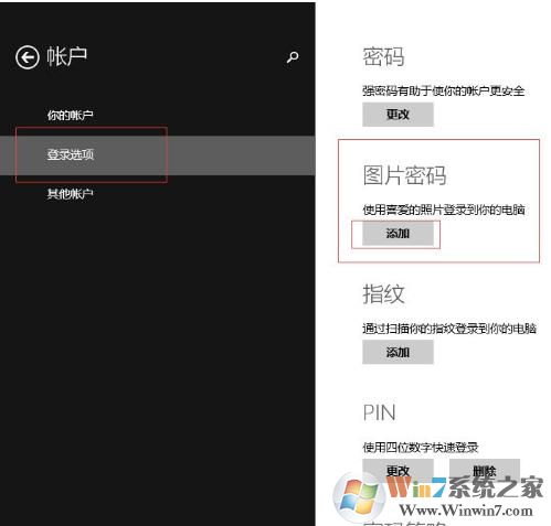 2, 在設(shè)置中找到【賬戶(hù)】,并選擇【登陸選項(xiàng)】,找到【圖片密碼】選擇【添加】,具體如下圖: