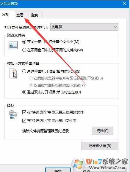 3、在打開的Windows10文件夾選項窗口中,我們點(diǎn)擊“查看”標(biāo)簽