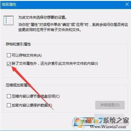 8、在打開的高級屬性窗口中,我們?nèi)∠?ldquo;除了文件屬性外,還允許索引此文件夾中的文件的內(nèi)容”前的復(fù)選框,最后點(diǎn)擊確定按鈕,重新啟動電腦后,可以發(fā)現(xiàn)假死現(xiàn)象沒有了。