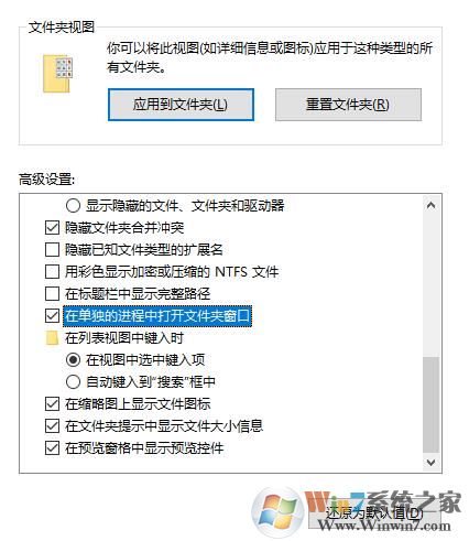 如果這個方法未能解決問題,你還可以在「文件夾選項 - 查看 - 高級設(shè)置」中找到「在單獨(dú)的進(jìn)程中打開文件夾窗口」,勾選后退出文件夾。