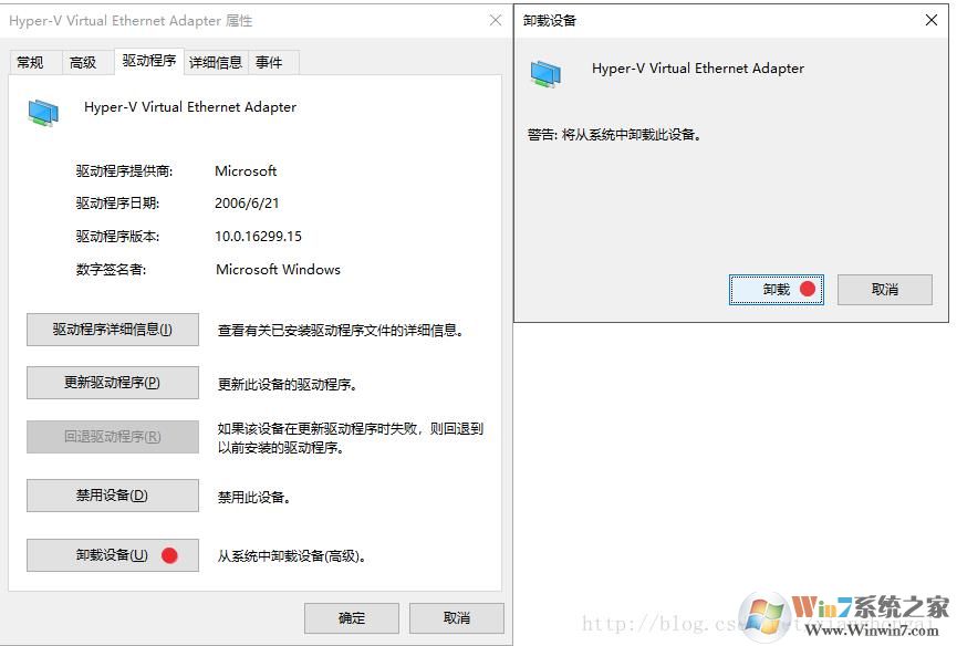 4、在驅(qū)動程序界面,點(diǎn)擊卸載設(shè)備,然后點(diǎn)擊卸載,這樣就可以把該vEthernet刪除掉了,其它的也一樣操作即可。
