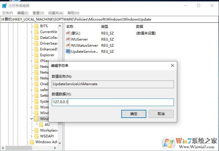 3、接下來創(chuàng)建三個(gè)字符串值,名稱分別是 "WUServer"、"WUStatusServer"、"UpdateServiceUrlAlternate",分別把數(shù)值都修改為"127.0.0.1" m.cncxm.com