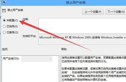 7、我們把該項設(shè)置為未配置或是已禁用,然后點擊確定按鈕保存退出,這樣以后就可以正常安裝程序了,如圖: