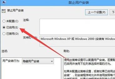 6、雙擊可打開禁止用戶安裝的編輯窗口,可以看到該項設(shè)置為已啟用,這就是導(dǎo)致不能正常安裝軟件的原因;