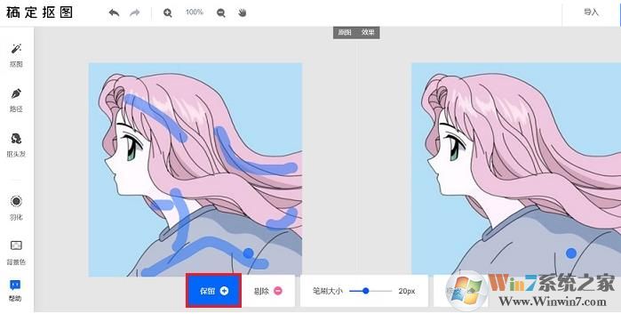 3、下面以摳圖一張透明微信頭像為例,上傳好需要摳圖的圖片后,首先點(diǎn)擊“保留”,然后在圖中劃出需要保留的部分,畫(huà)一道線即可。然后點(diǎn)擊“剔除”,在需要去除的部分畫(huà)一道紅色即可~。