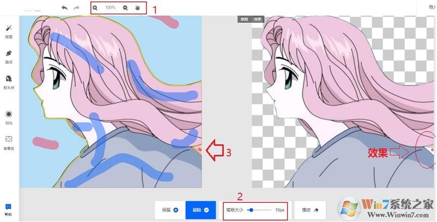 4、如果一些圖片需要處理一些細(xì)節(jié)部分,則還可以在頂部放大圖片,再結(jié)合底部的“筆刷大小”可以調(diào)節(jié)筆刷大小,這樣可以輕松處理器一些細(xì)節(jié)部分,如下圖所示。